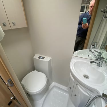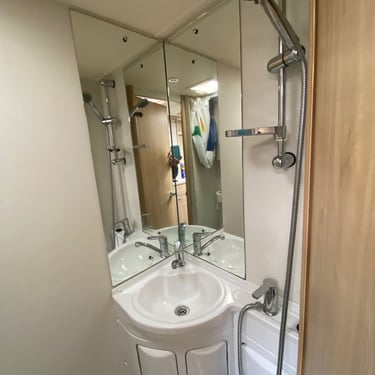 Washroom: Combined washroom with shower, cassette toilet, and sink.